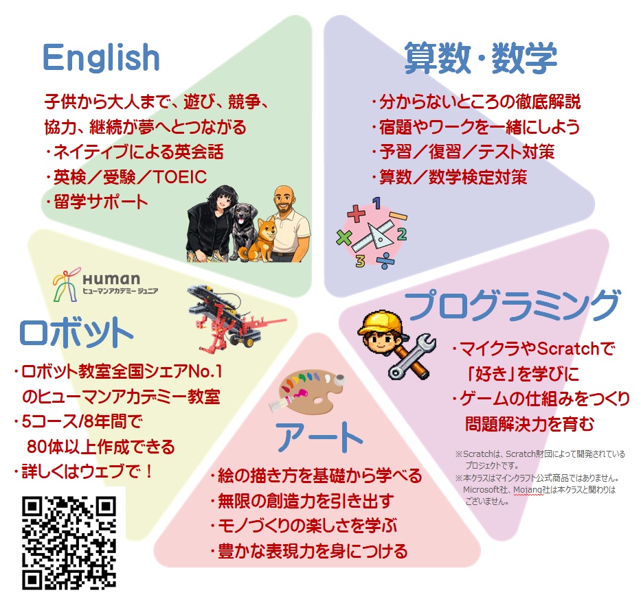 当社の業務は、大きく上記の5つの事業に分類できます。ロボット教室は、ヒューマンアカデミーのフランチャイズ教室です。